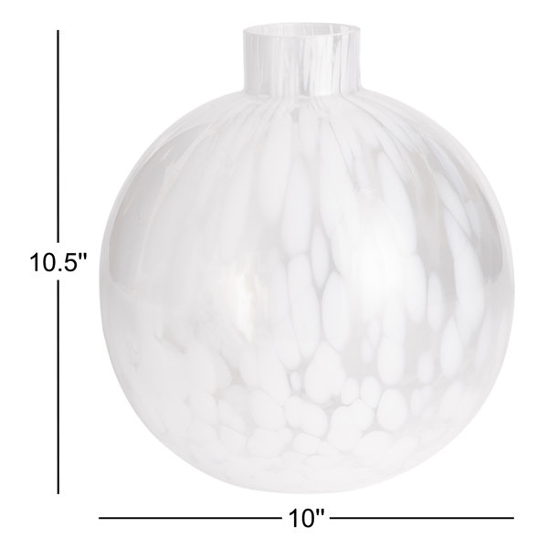 Glass blown, with milk glass beads melted in slowly to create a gorgeous spotted pattern, this round vase is a truly one of a kind piece. An exquisite accent for side table, mantel or bookshelf.