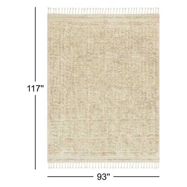 This area rug combines a soft, shaggy texture with a neutral color palette to give you a versatile piece you'll love to show off just about anywhere. It's handmade from a wool blend using a hand-tufted technique. The medium 0.35" pile height is a great choice for high traffic areas because it's easy to clean while still offering some extra padding underfoot. We especially love the tassel fringe on each end, which adds additional depth, dimension, and tasteful texture. To keep this area rug in place, we recommend pairing it with a rug pad to help reduce shifting and sliding.